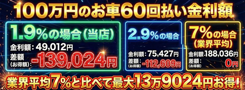 同じ100万円のお車を購入した場合でも、金利だけで14万円近いほどの差が出る可能性もあります。