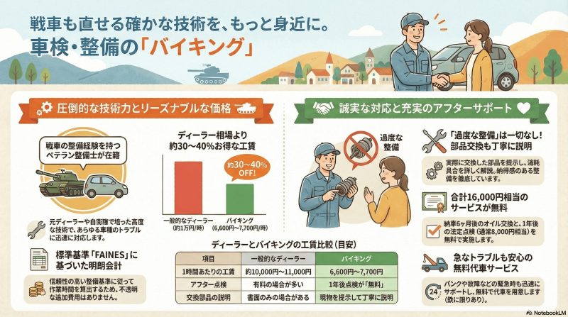 納車1年後、又は車検を取った1年後は無料点検を実施致します。通常8,000円相当のサービスが無料で受けられるのはバイキングだけ♪